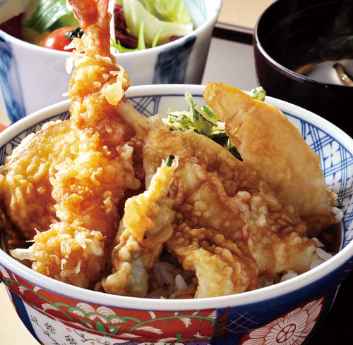 季節の食材を大切にした本格天ぷらを、甘さを抑えた関東風のだしにくぐらせた、本格江戸前天丼です。